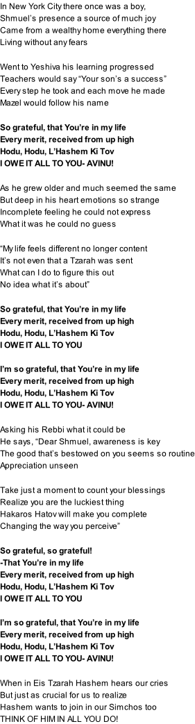 This song is more than a song. It’s a message to everyone. We really have so much to be grateful for in our lives! My hope is that it can be applied to our lives just like it was an integral part in the life of that Yid at the Kosel. It can change our perspective of the world and make us into much happier people. So certainly after a beautiful project like this, it would seem appropriate to show gratitude to Hashem Yisborach, but we know that if we begin thanking Hashem for all that He did in making this possible, the list would never end. So just a few mere words will have to suffice: